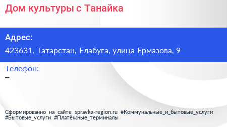 Дом культуры, с. Танайка по адресу 423631, Татарстан, Елабуга, улица Ермазова, 9 в дальнейшем Организация, размещена в следующих категориях: