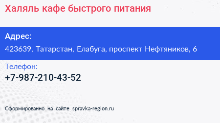 Халяль, кафе быстрого питания по адресу 423639, Татарстан, Елабуга, проспект Нефтяников, 6 в дальнейшем Организация, размещена в следующих категориях: