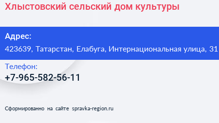 Хлыстовский сельский дом культуры по адресу 423639, Татарстан, Елабуга, Интернациональная улица, 31 в дальнейшем Организация, размещена в следующих категориях: