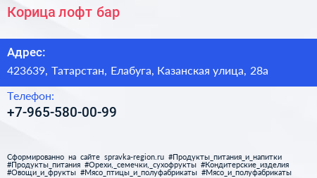 Корица, лофт-бар по адресу 423639, Татарстан, Елабуга, Казанская улица, 28а в дальнейшем Организация, размещена в следующих категориях: