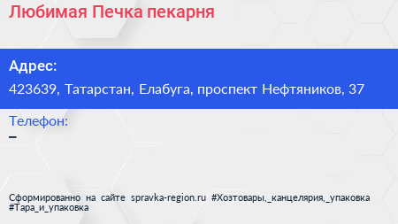 Любимая Печка, пекарня по адресу 423639, Татарстан, Елабуга, проспект Нефтяников, 37 в дальнейшем Организация, размещена в следующих категориях: