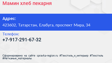 Мамин хлеб, пекарня по адресу 423602, Татарстан, Елабуга, проспект Мира, 34 в дальнейшем Организация, размещена в следующих категориях:
