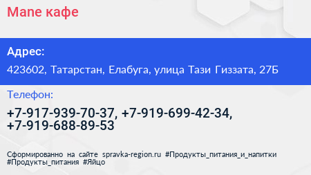 Mane, кафе по адресу 423602, Татарстан, Елабуга, улица Тази Гиззата, 27Б в дальнейшем Организация, размещена в следующих категориях: