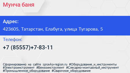 Мунча, баня по адресу 423605, Татарстан, Елабуга, улица Тугарова, 5 в дальнейшем Организация, размещена в следующих категориях: