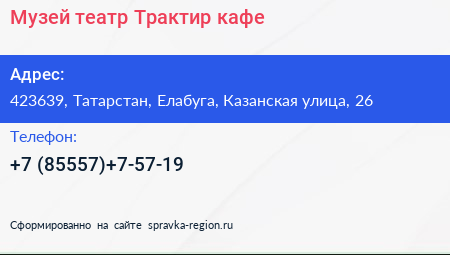 Музей-театр Трактир, кафе по адресу 423639, Татарстан, Елабуга, Казанская улица, 26 в дальнейшем Организация, размещена в следующих категориях: