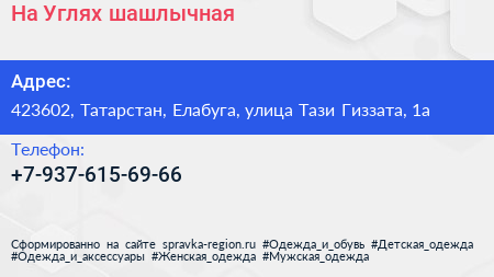 На Углях, шашлычная по адресу 423602, Татарстан, Елабуга, улица Тази Гиззата, 1а в дальнейшем Организация, размещена в следующих категориях: