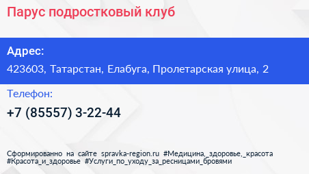 Парус, подростковый клуб по адресу 423603, Татарстан, Елабуга, Пролетарская улица, 2 в дальнейшем Организация, размещена в следующих категориях: