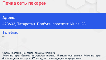 Печка, сеть пекарен по адресу 423602, Татарстан, Елабуга, проспект Мира, 28 в дальнейшем Организация, размещена в следующих категориях: