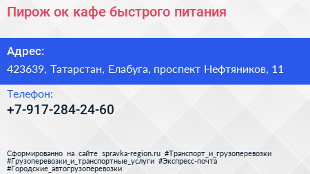Пирож`ок, кафе быстрого питания по адресу 423639, Татарстан, Елабуга, проспект Нефтяников, 11 в дальнейшем Организация, размещена в следующих категориях: