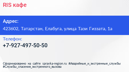 RIS, кафе по адресу 423602, Татарстан, Елабуга, улица Тази Гиззата, 1а в дальнейшем Организация, размещена в следующих категориях: