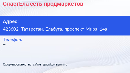 СластЕла, сеть продмаркетов по адресу 423602, Татарстан, Елабуга, проспект Мира, 14а в дальнейшем Организация, размещена в следующих категориях: