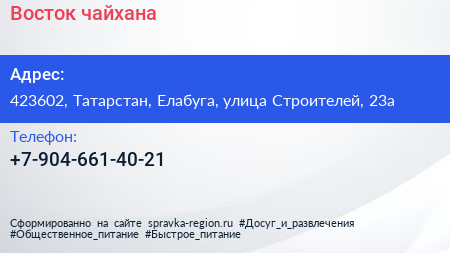 Восток, чайхана по адресу 423602, Татарстан, Елабуга, улица Строителей, 23а в дальнейшем Организация, размещена в следующих категориях: