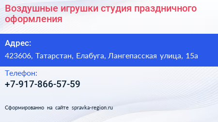 Воздушные игрушки, студия праздничного оформления по адресу 423606, Татарстан, Елабуга, Лангепасская улица, 15а в дальнейшем Организация, размещена в следующих категориях: