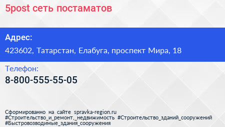 5post, сеть постаматов по адресу 423602, Татарстан, Елабуга, проспект Мира, 18 в дальнейшем Организация, размещена в следующих категориях: