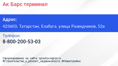 Ак Барс, терминал по адресу 423603, Татарстан, Елабуга, улица Разведчиков, 52а в дальнейшем Организация, размещена в следующих категориях:
