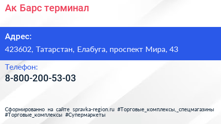 Ак Барс, терминал по адресу 423602, Татарстан, Елабуга, проспект Мира, 43 в дальнейшем Организация, размещена в следующих категориях: