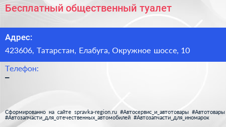 Бесплатный общественный туалет по адресу 423606, Татарстан, Елабуга, Окружное шоссе, 10 в дальнейшем Организация, размещена в следующих категориях: