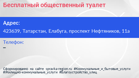 Бесплатный общественный туалет по адресу 423639, Татарстан, Елабуга, проспект Нефтяников, 11а в дальнейшем Организация, размещена в следующих категориях: