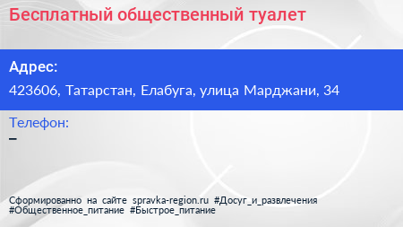 Бесплатный общественный туалет по адресу 423606, Татарстан, Елабуга, улица Марджани, 34 в дальнейшем Организация, размещена в следующих категориях: