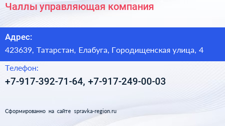 Чаллы, управляющая компания по адресу 423639, Татарстан, Елабуга, Городищенская улица, 4 в дальнейшем Организация, размещена в следующих категориях: