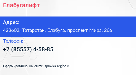 Елабугалифт по адресу 423602, Татарстан, Елабуга, проспект Мира, 26а в дальнейшем Организация, размещена в следующих категориях: