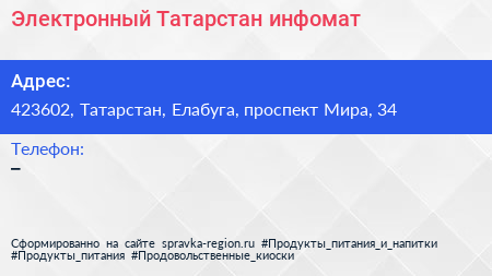 Электронный Татарстан, инфомат по адресу 423602, Татарстан, Елабуга, проспект Мира, 34 в дальнейшем Организация, размещена в следующих категориях: