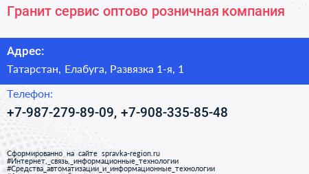 Гранит сервис, оптово-розничная компания по адресу Татарстан, Елабуга, Развязка 1-я, 1 в дальнейшем Организация, размещена в следующих категориях: