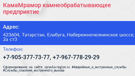 КамаМрамор, камнеобрабатывающее предприятие по адресу 423604, Татарстан, Елабуга, Набережночелнинское шоссе, 2а ст3 в дальнейшем Организация, размещена в следующих категориях: