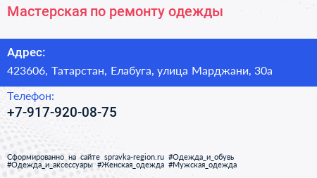 Мастерская по ремонту одежды по адресу 423606, Татарстан, Елабуга, улица Марджани, 30а в дальнейшем Организация, размещена в следующих категориях: