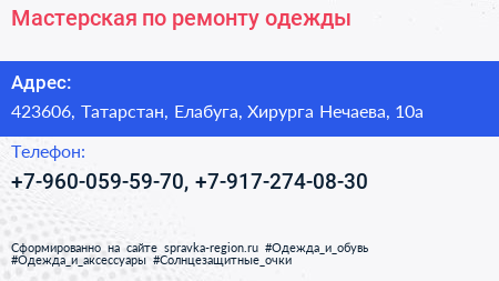 Мастерская по ремонту одежды по адресу 423606, Татарстан, Елабуга, Хирурга Нечаева, 10а в дальнейшем Организация, размещена в следующих категориях: