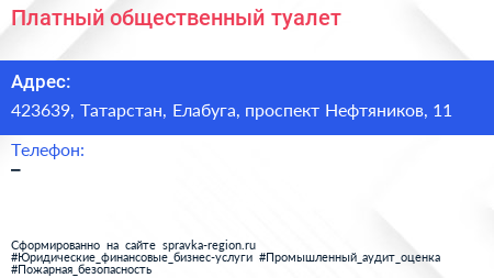 Платный общественный туалет по адресу 423639, Татарстан, Елабуга, проспект Нефтяников, 11 в дальнейшем Организация, размещена в следующих категориях: