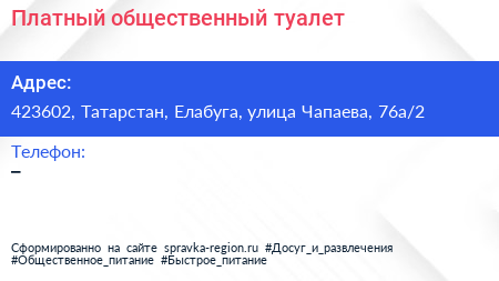 Платный общественный туалет по адресу 423602, Татарстан, Елабуга, улица Чапаева, 76а/2 в дальнейшем Организация, размещена в следующих категориях: