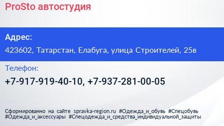 ProSto, автостудия по адресу 423602, Татарстан, Елабуга, улица Строителей, 25в в дальнейшем Организация, размещена в следующих категориях: