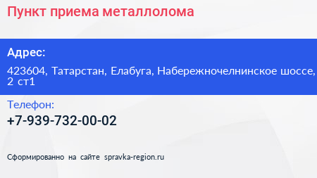 Пункт приема металлолома по адресу 423604, Татарстан, Елабуга, Набережночелнинское шоссе, 2 ст1 в дальнейшем Организация, размещена в следующих категориях:
