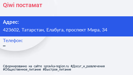 Qiwi, постамат по адресу 423602, Татарстан, Елабуга, проспект Мира, 34 в дальнейшем Организация, размещена в следующих категориях: