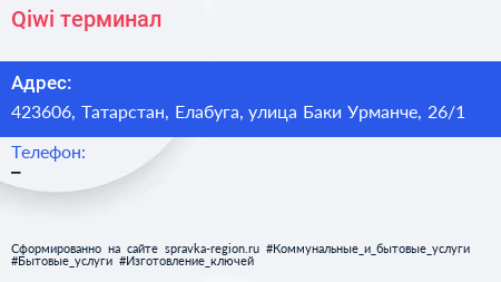 Qiwi, терминал по адресу 423606, Татарстан, Елабуга, улица Баки Урманче, 26/1 в дальнейшем Организация, размещена в следующих категориях: