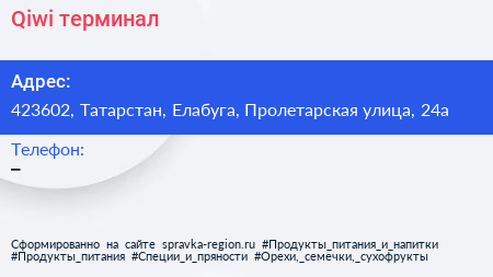 Qiwi, терминал по адресу 423602, Татарстан, Елабуга, Пролетарская улица, 24а в дальнейшем Организация, размещена в следующих категориях: