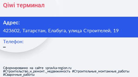 Qiwi, терминал по адресу 423602, Татарстан, Елабуга, улица Строителей, 19 в дальнейшем Организация, размещена в следующих категориях: