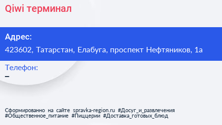 Qiwi, терминал по адресу 423602, Татарстан, Елабуга, проспект Нефтяников, 1а в дальнейшем Организация, размещена в следующих категориях: