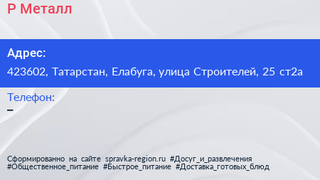 Р-Металл по адресу 423602, Татарстан, Елабуга, улица Строителей, 25 ст2а в дальнейшем Организация, размещена в следующих категориях: