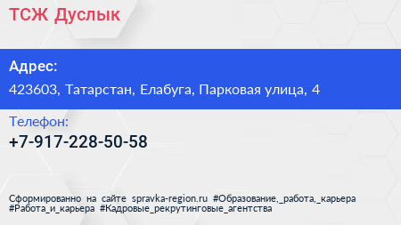 ТСЖ Дуслык по адресу 423603, Татарстан, Елабуга, Парковая улица, 4 в дальнейшем Организация, размещена в следующих категориях: