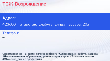 ТСЖ Возрождение по адресу 423600, Татарстан, Елабуга, улица Гассара, 20а в дальнейшем Организация, размещена в следующих категориях: