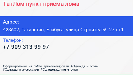 ТатЛом, пункт приема лома по адресу 423602, Татарстан, Елабуга, улица Строителей, 27 ст1 в дальнейшем Организация, размещена в следующих категориях: