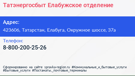Татэнергосбыт, Елабужское отделение по адресу 423606, Татарстан, Елабуга, Окружное шоссе, 37а в дальнейшем Организация, размещена в следующих категориях: