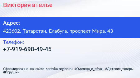Виктория, ателье по адресу 423602, Татарстан, Елабуга, проспект Мира, 43 в дальнейшем Организация, размещена в следующих категориях: