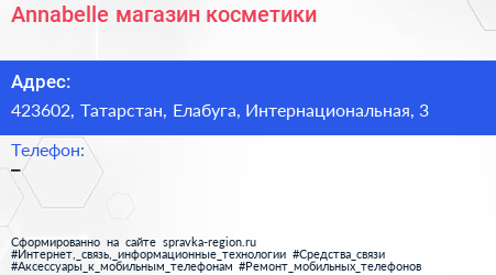 Annabelle, магазин косметики по адресу 423602, Татарстан, Елабуга, Интернациональная, 3 в дальнейшем Организация, размещена в следующих категориях: