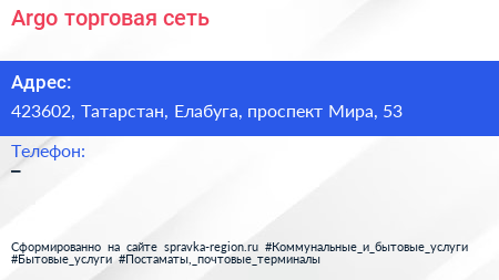 Argo, торговая сеть по адресу 423602, Татарстан, Елабуга, проспект Мира, 53 в дальнейшем Организация, размещена в следующих категориях: