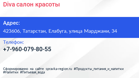Diva, салон красоты по адресу 423606, Татарстан, Елабуга, улица Марджани, 34 в дальнейшем Организация, размещена в следующих категориях: