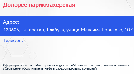 Долорес, парикмахерская по адресу 423605, Татарстан, Елабуга, улица Максима Горького, 107Б в дальнейшем Организация, размещена в следующих категориях: