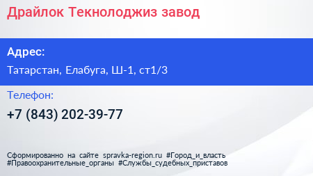 Драйлок Текнолоджиз, завод по адресу Татарстан, Елабуга, Ш-1, ст1/3 в дальнейшем Организация, размещена в следующих категориях: